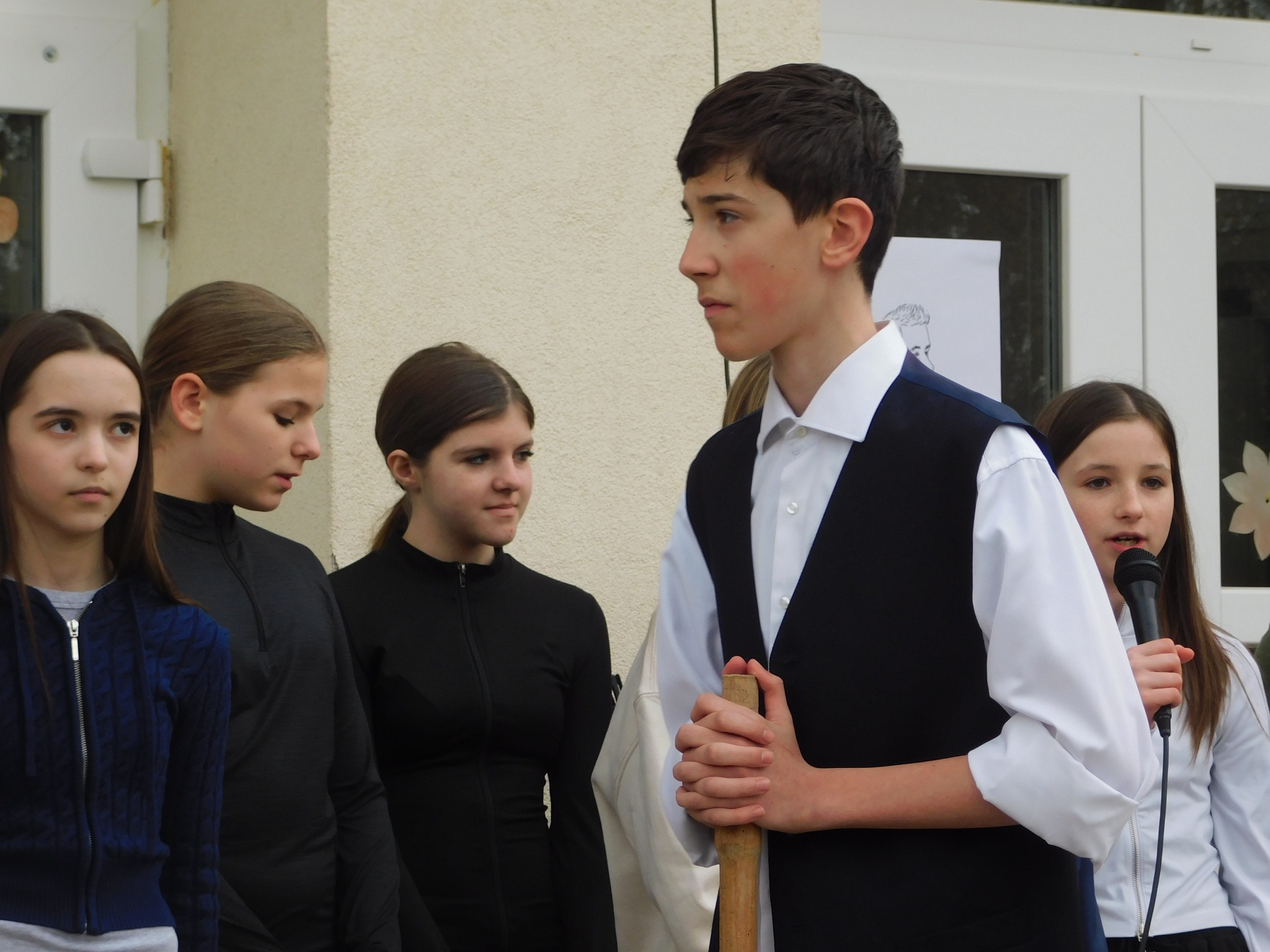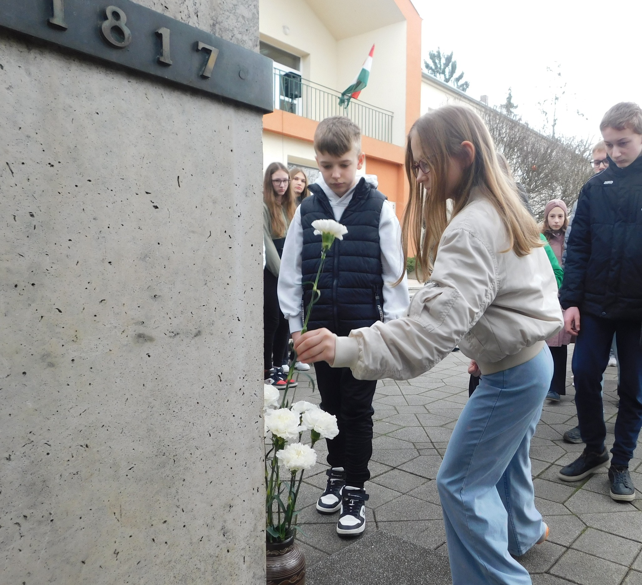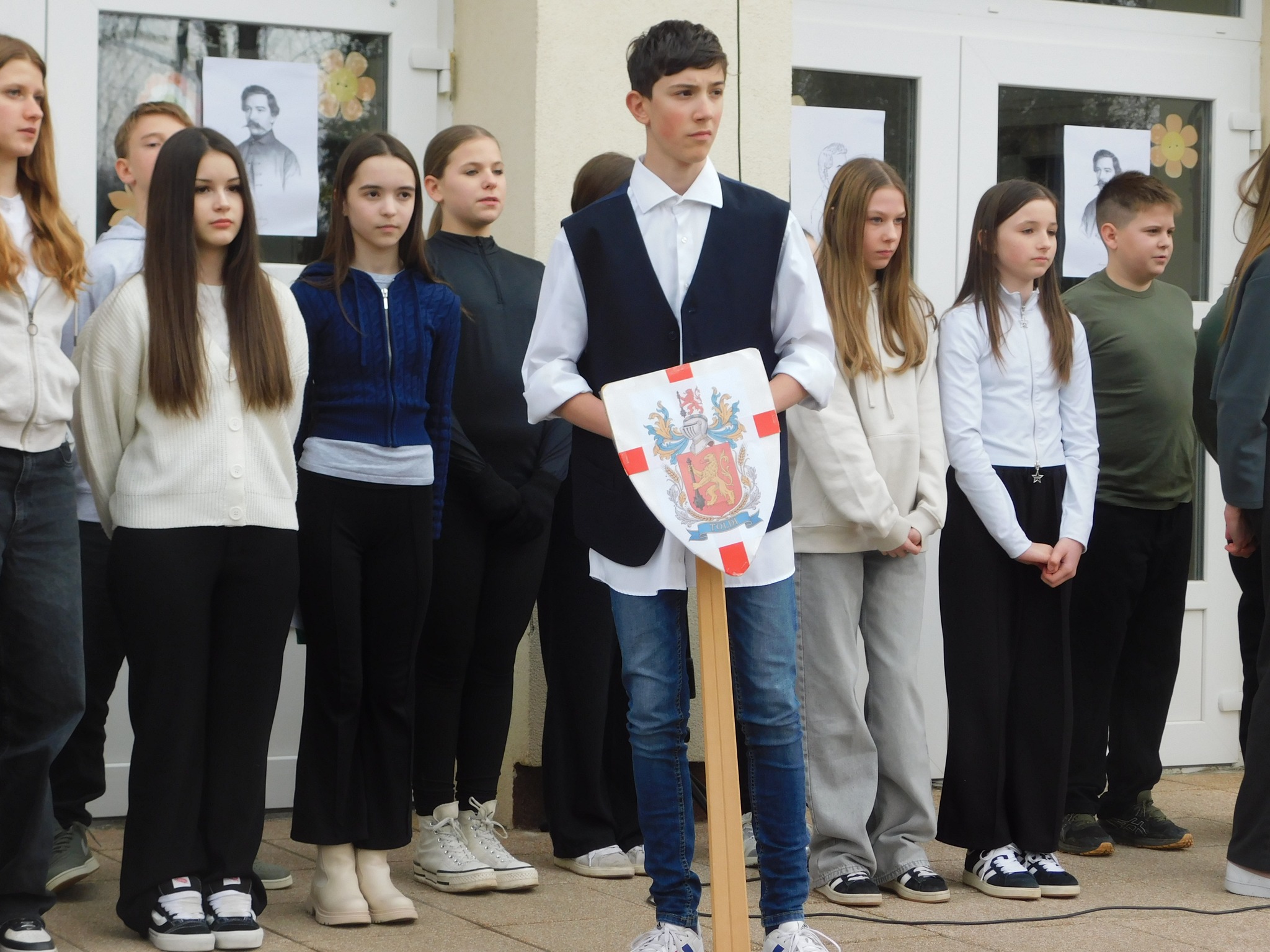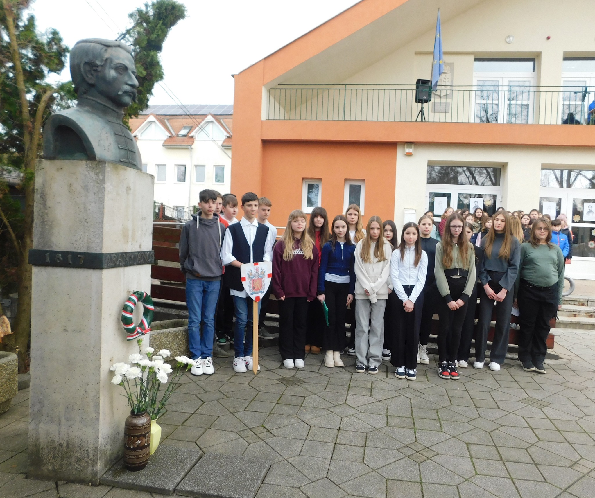 Ma iskolánk névadójára, Arany Jánosra emlékeztünk. A 7. b osztály és az énekkar adott zenés, szöveges ünnepi műsort, melyet pantomimjátékkal kötöttek össze. Műsoruk tematikája a múlt és jelen találkozására épült. Az előadás során rendhagyó módon felidézték Arany János életét, valamint egyik fő művének hősét,Toldi Miklóst is az iskola tanulói előtt.