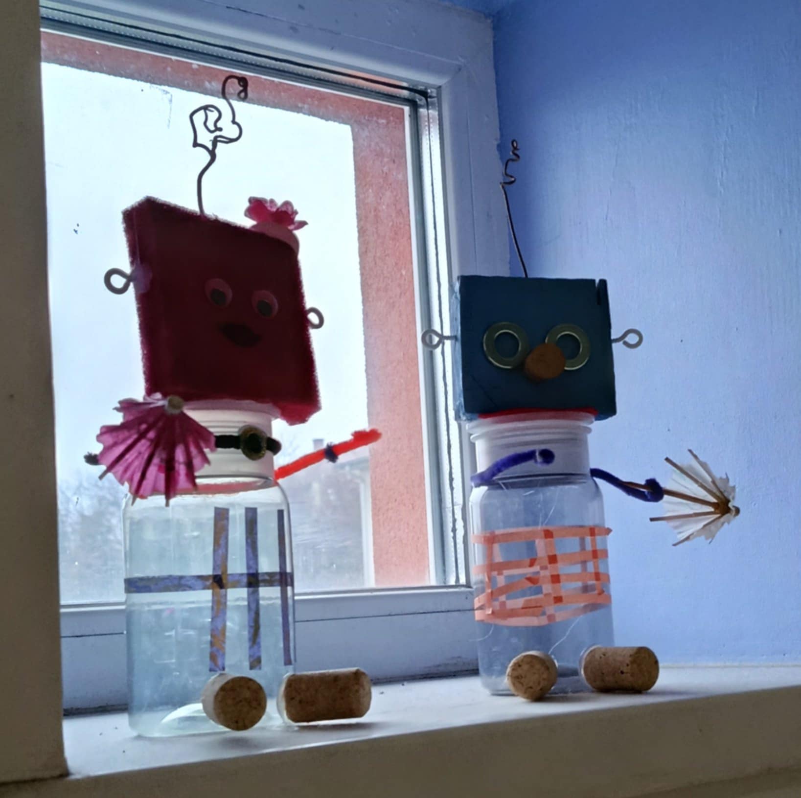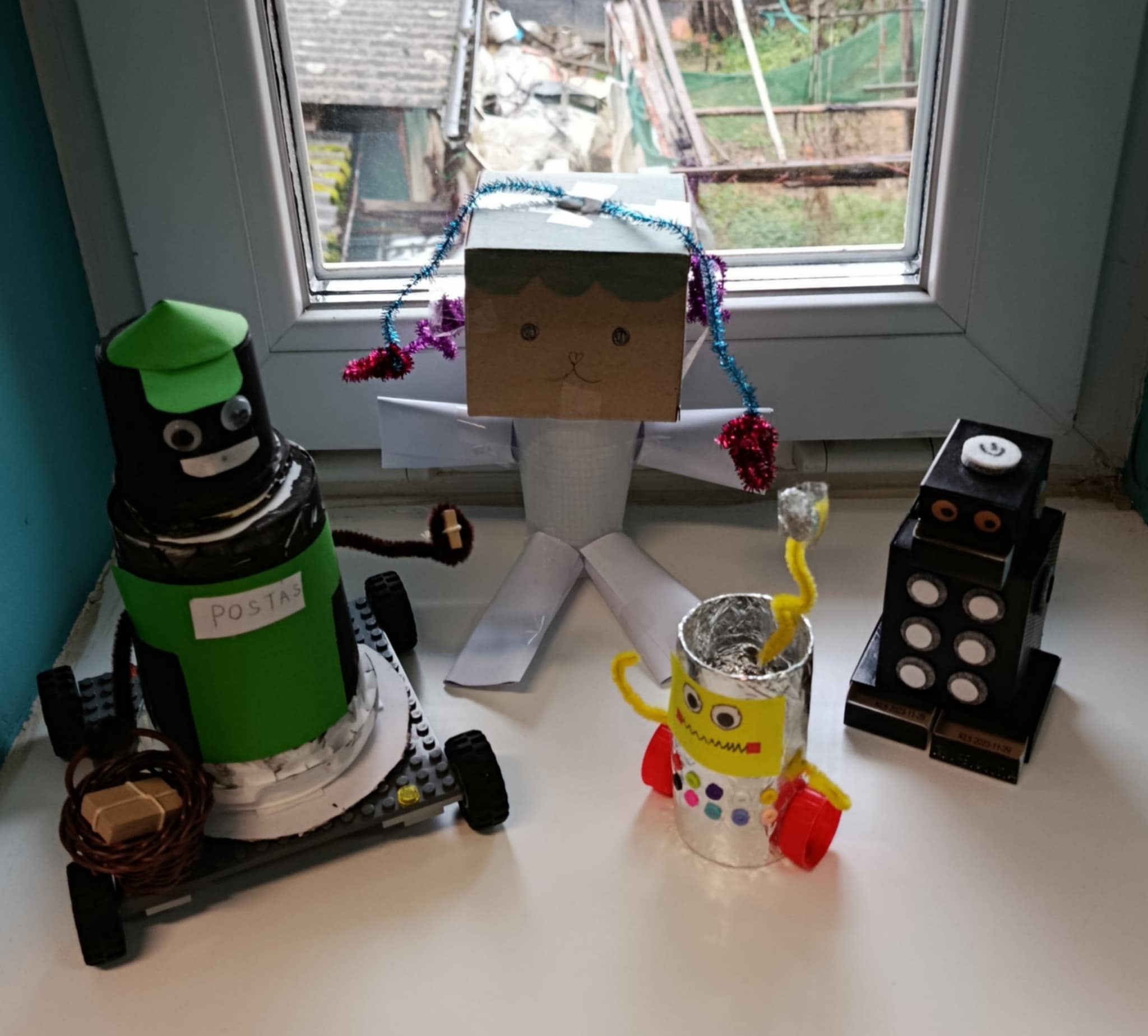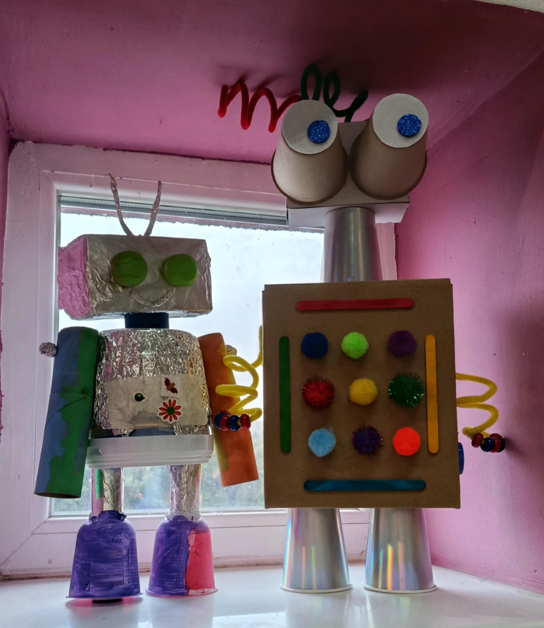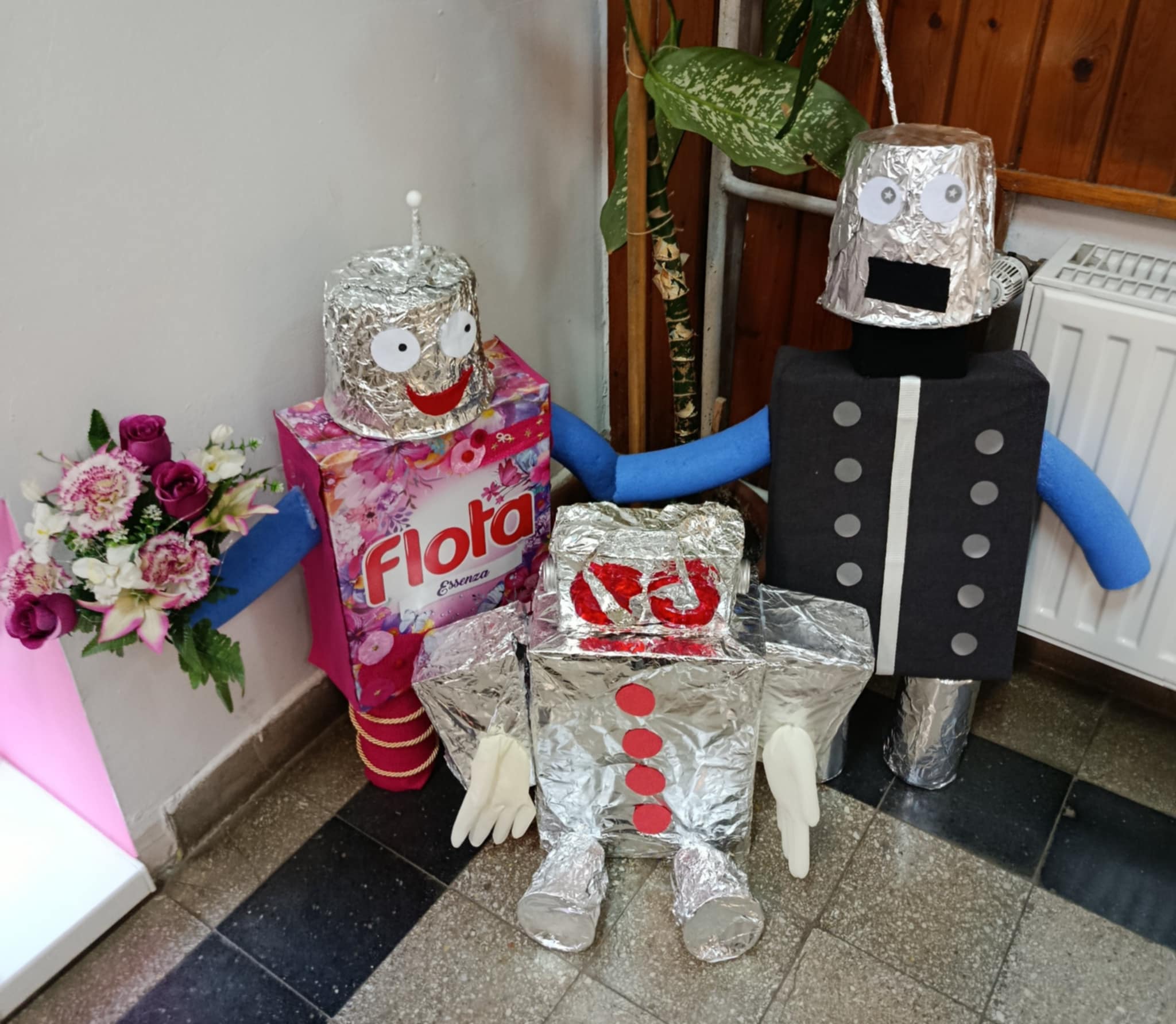 A gyerekek rengeteg ötletet hoztak, ügyesen terveztek, különféle alapanyagokat használtak, és többféle technikával dolgoztak. A robotok kartonból, kupakokból, fémből, szivacsból, fonalból és egyéb kreatív kellékekből születtek meg – minden darab egyedi és kifejező lett!