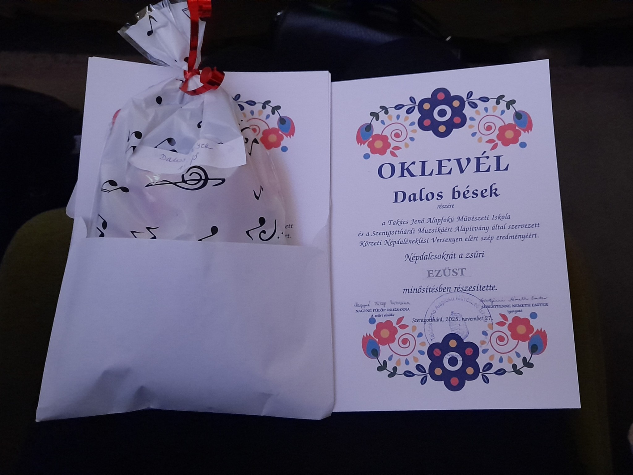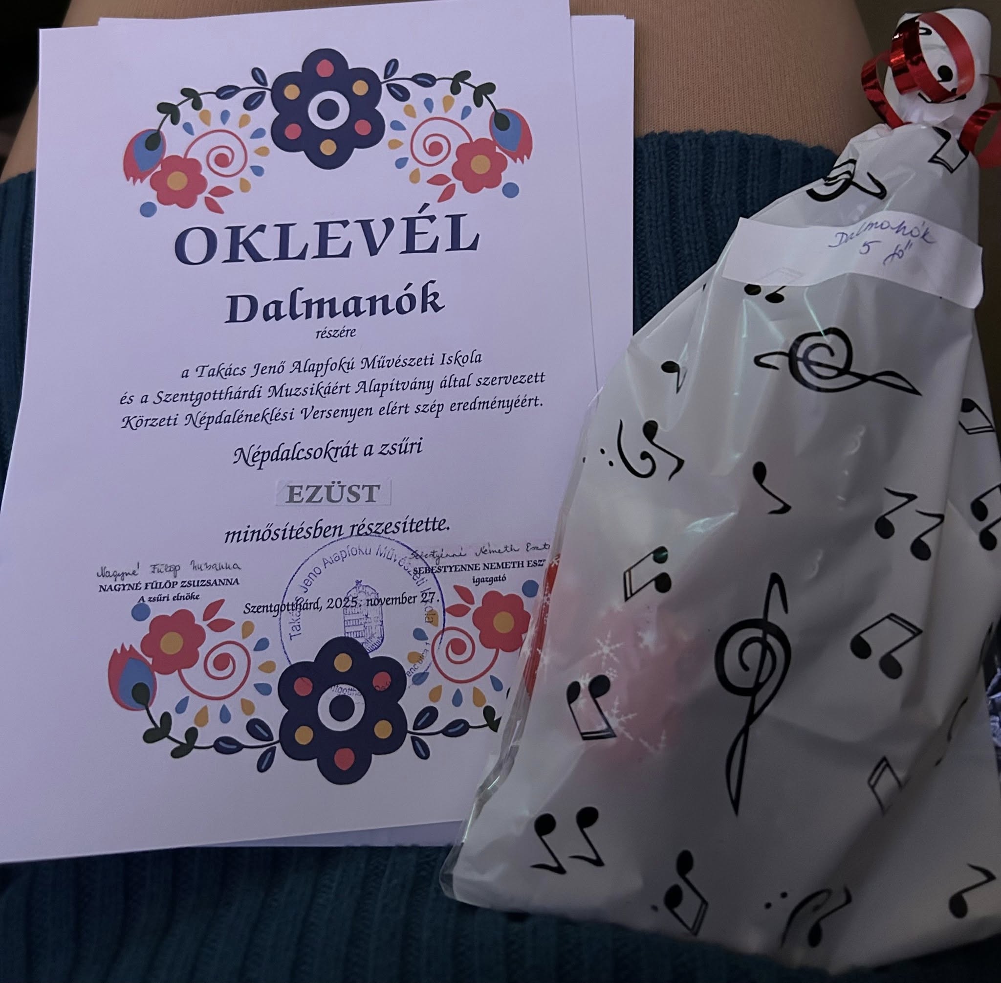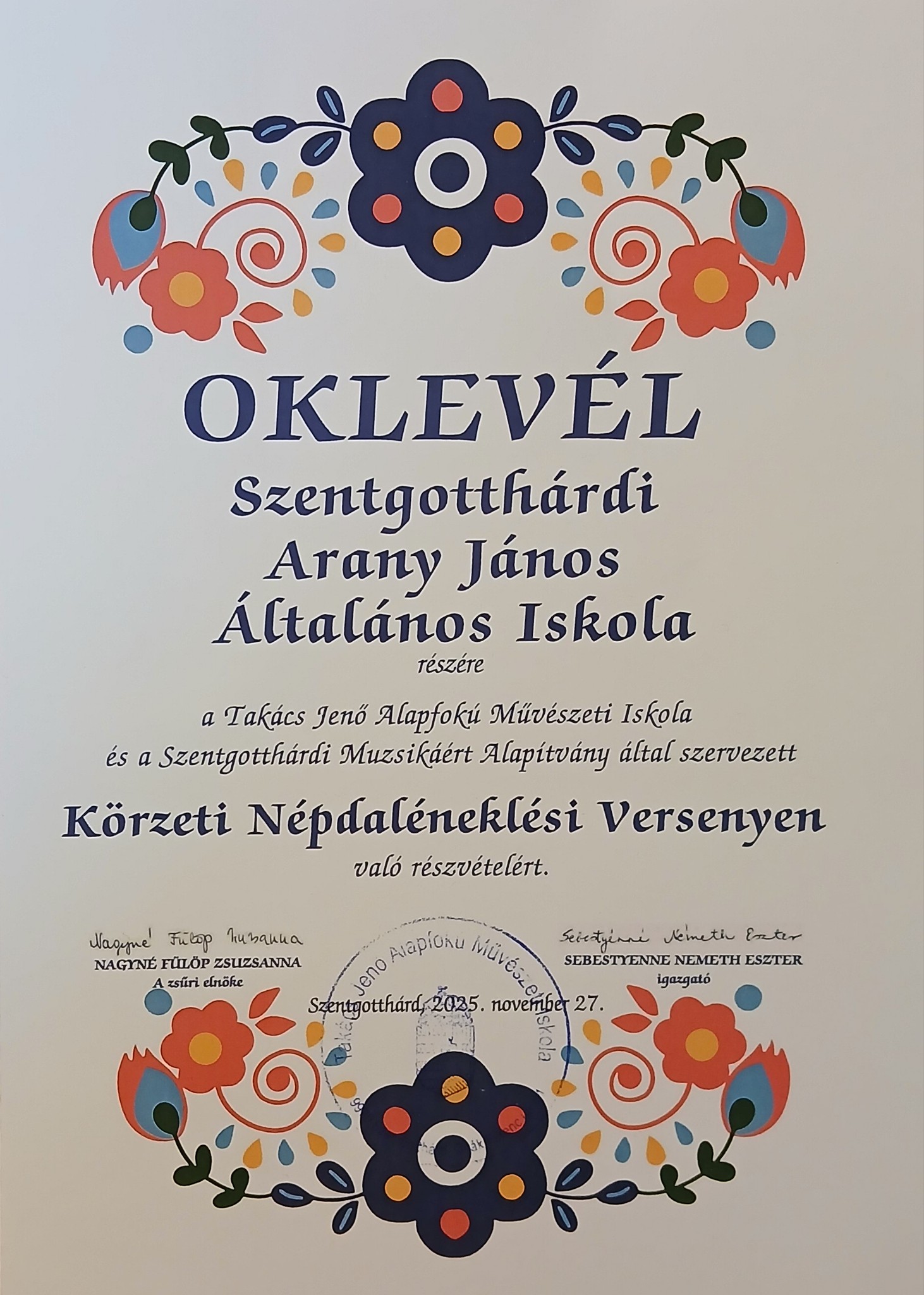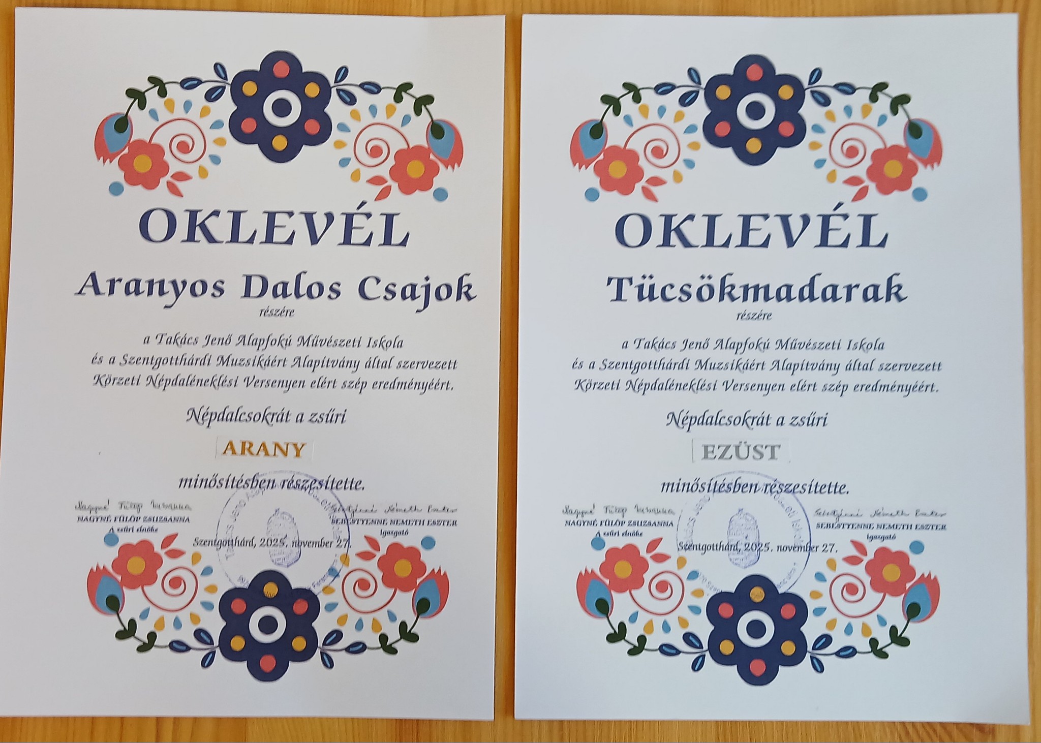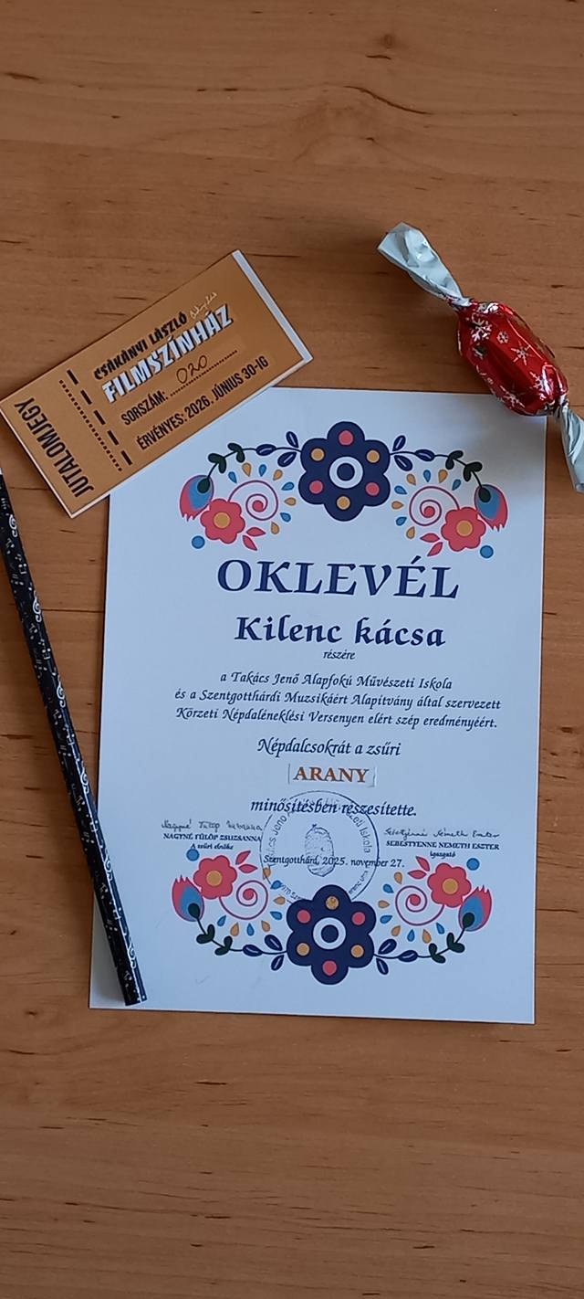 A Takács Jenő Alapfokú Művészeti Iskola és a Szentgotthárdi Muzsikáért Alapítvány által szervezett Körzeti Népdaléneklési Versenyen iskolánk tanulói nagyon szép eredményt értek el. A zsűri arany és ezüst minősítésben részesítette a lelkesen készülő kis csoportjainkat.