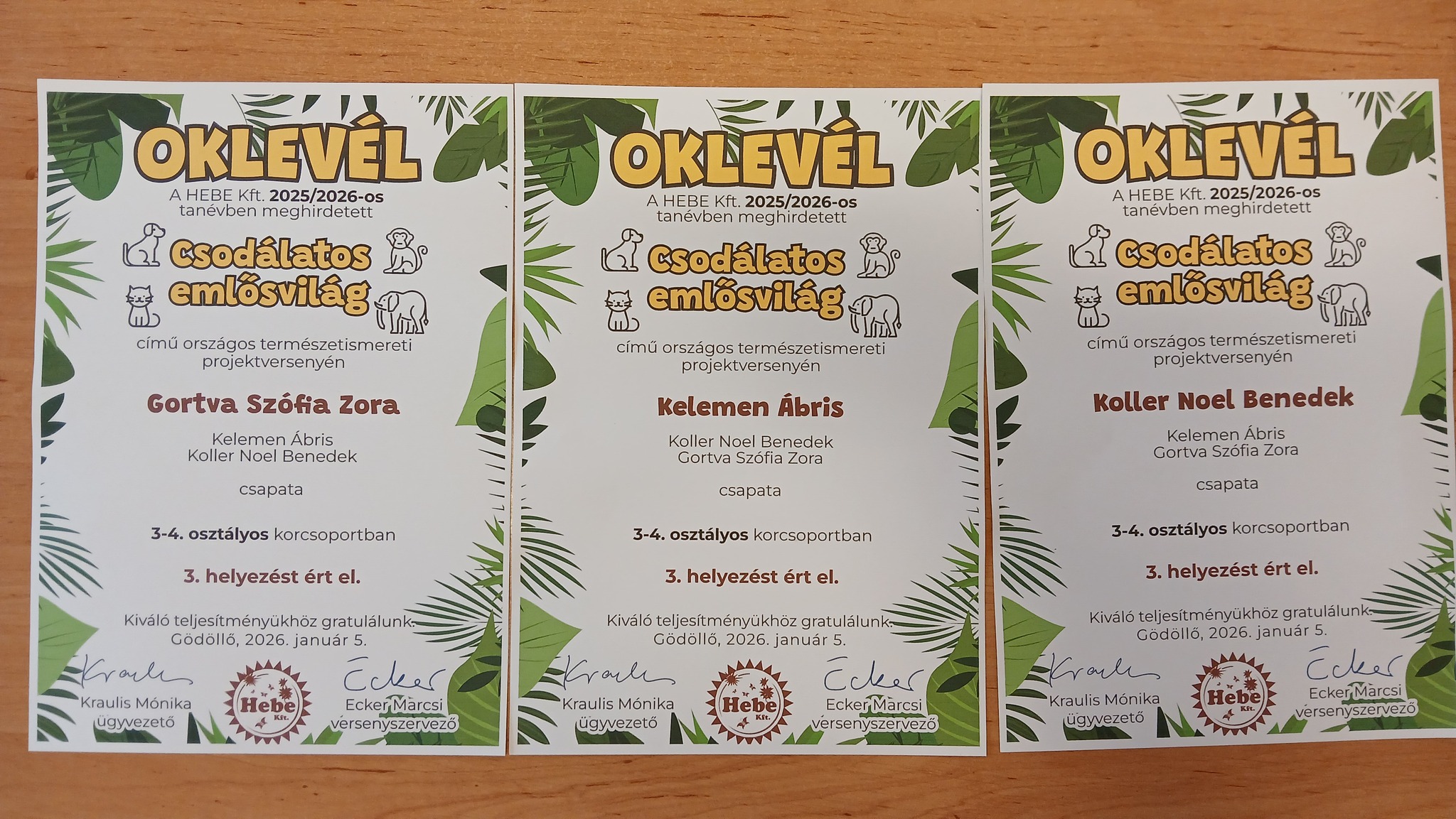 3.c.osztályos tanulóink a Hebe Csodálatos emlősvilág országos természetismereti projektversenyen 3. helyezést értek el! A rengeteg munka, kitartás meghozta az eredményt Gortva Szófia Zora, Koller Noel