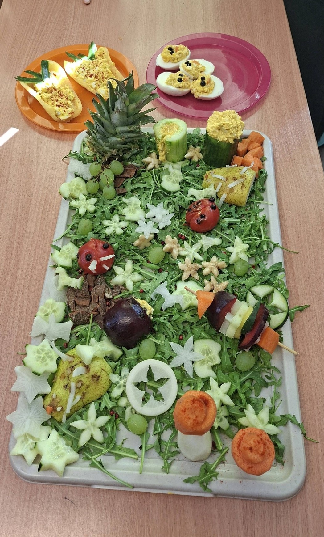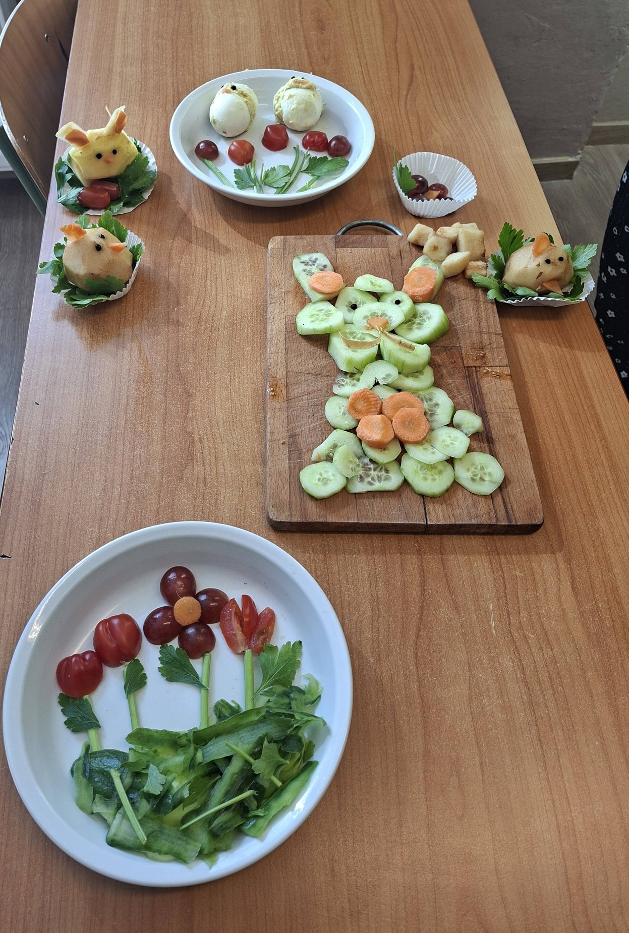 A program során a gyerekek különféle ételeket készítettek tojásból, zöldségekből és gyümölcsökből. A tojásételek között szerepeltek töltött tojások, tojáskrémek és vidám, húsvéti hangulatú tojásfigurák is. A zöldségekből színes saláták és díszes zöldségtálak készültek, míg a gyümölcsökből ízletes gyümölcssaláták és kreatív gyümölcskompozíciók születtek.